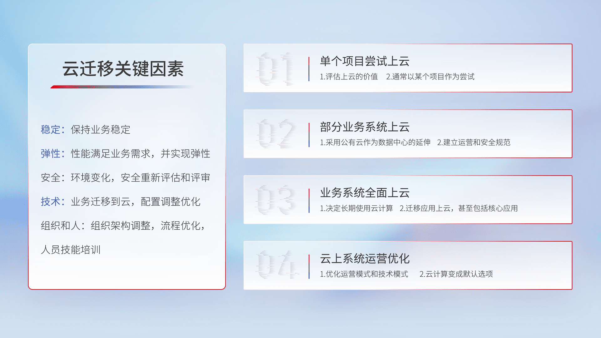 结合实际业务,,,从规划设计、、、云平台选型、、、、云原生改造、、数据迁移、、、、集成交付,,,迁移全过程为客户识别最佳上云路径,,做好风险识别管理,,,设计网络架构、、、身份权限、、、、安全审计合规、、、、操作审计、、、、日志审计、、监控告警策略、、多站点容灾设计等,,,,对云上基础设施进行整体规划,,,,提升IT治理水平,,以满足弹性、、、高可用、、高性能的需求。。。