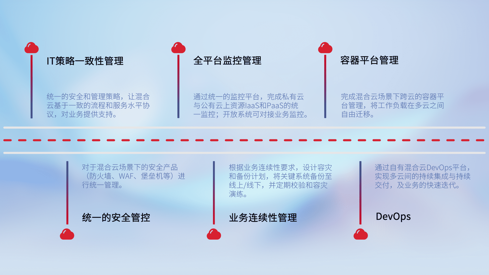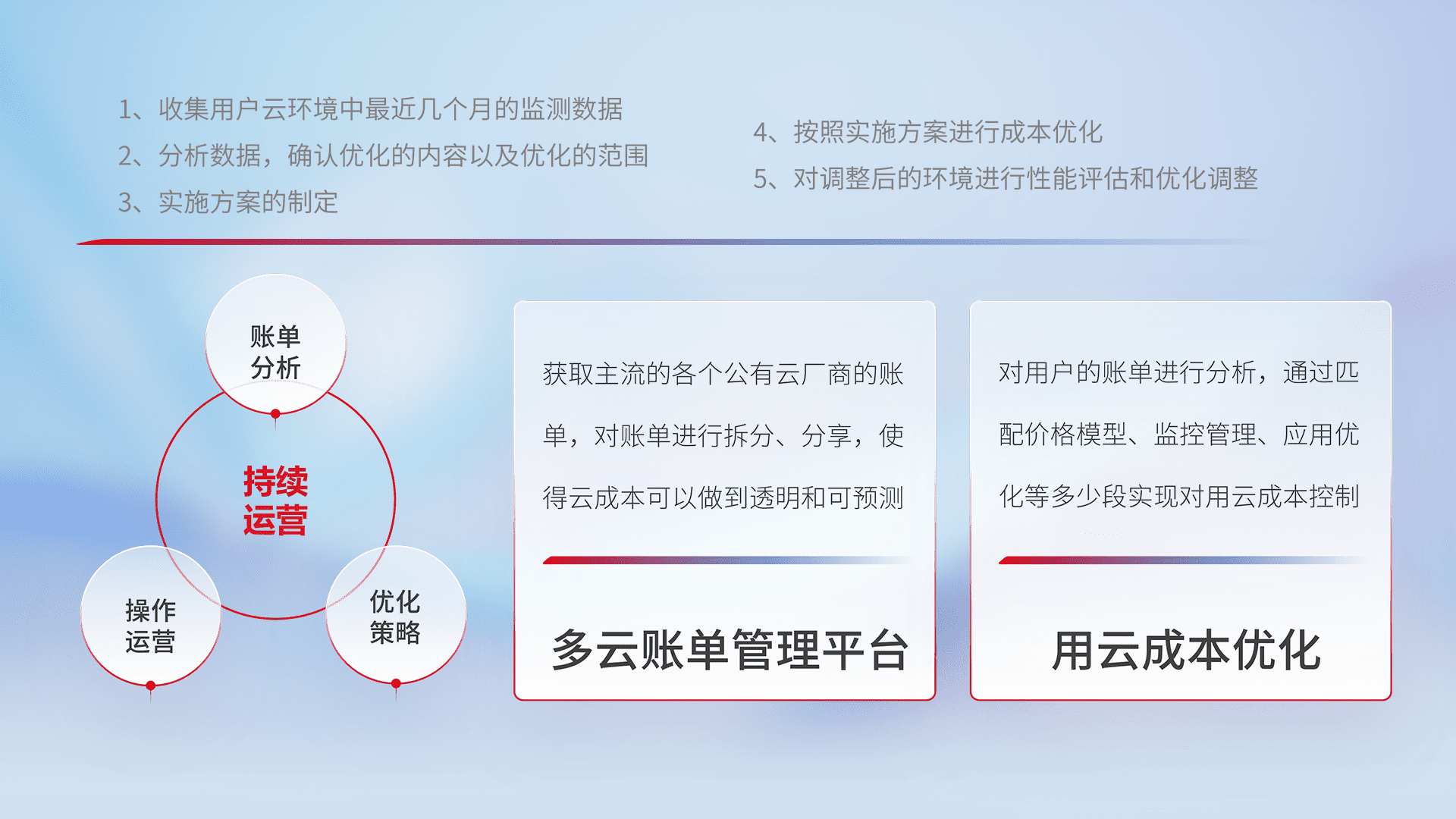 通过多云纳管,,,,以统一的资源数据模型把客户的云资源进行抽象和封装,,进而实现对多云资源的统一操作,,,,保障云资源管理的可靠性、、稳定性与可用性。。。。量身定制化运维内容,,配置、、、开发运维、、、补丁管理、、备份、、、监控、、、认证和访问管理、、、审计和日常巡检等,,保障在用云过程中的可靠度,,,稳定度以及高可用率。。。